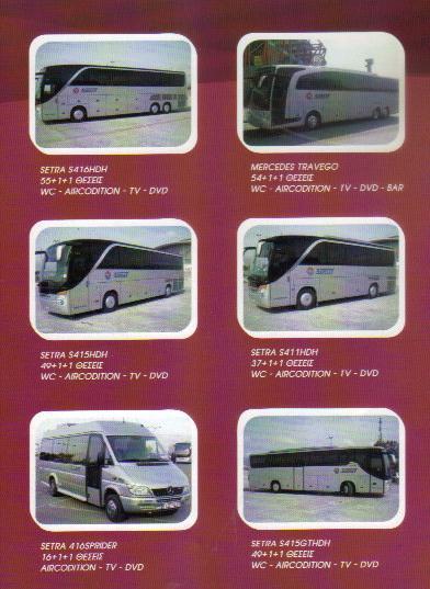 Το σύνολο των οχημάτων μας αποτελείται από σύγχρονα μοντέλα SETRA, MERCEDES και NEOPLAN, εξοπλισμένα με κλιματισμό, DVD player, τηλεόραση, μικρόφωνο και Wi-Fi καθώς και αναπαυτικά καθίσματα, μεγάλα πανοραμικά παράθυρα και ψυγείο. Τα γραφεία μας βρίσκονται σε συνεχή επικοινωνία με υπαλλήλους και πελάτες, προσφέροντας υπηρεσίες σε 24ωρη βάση.